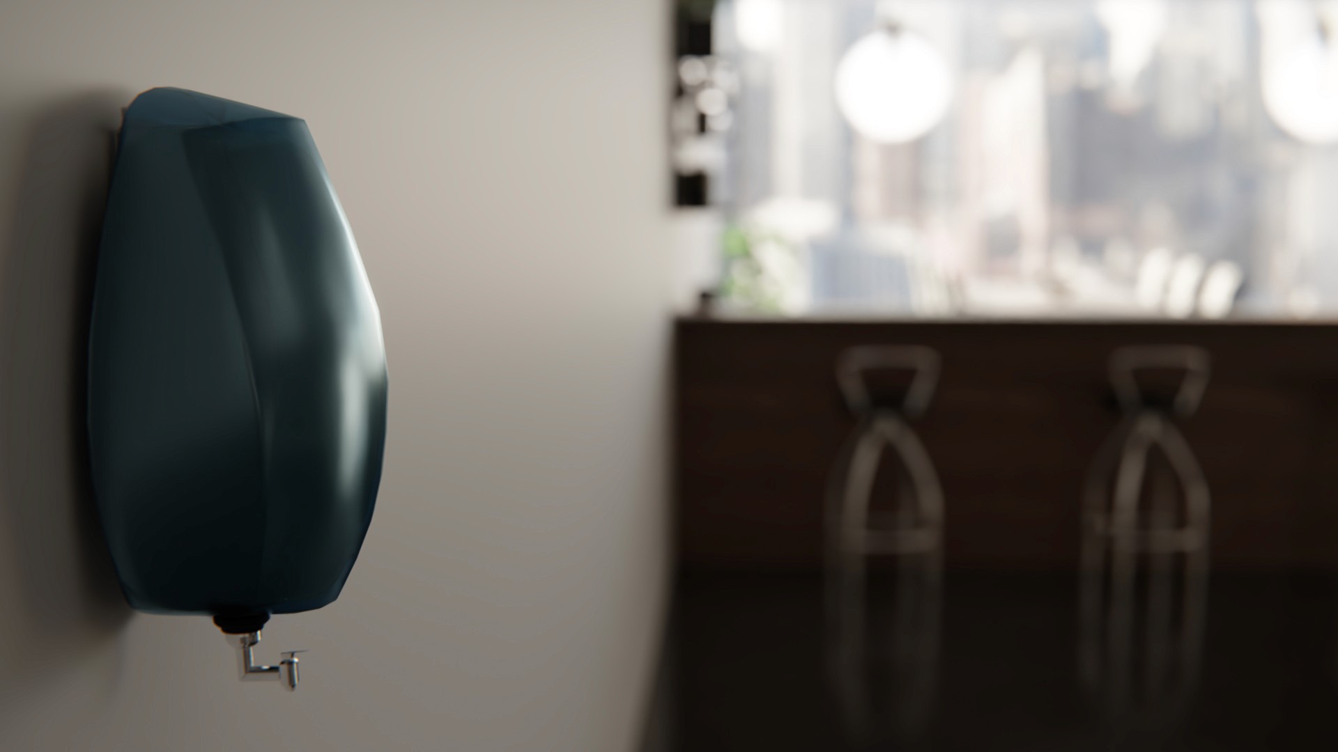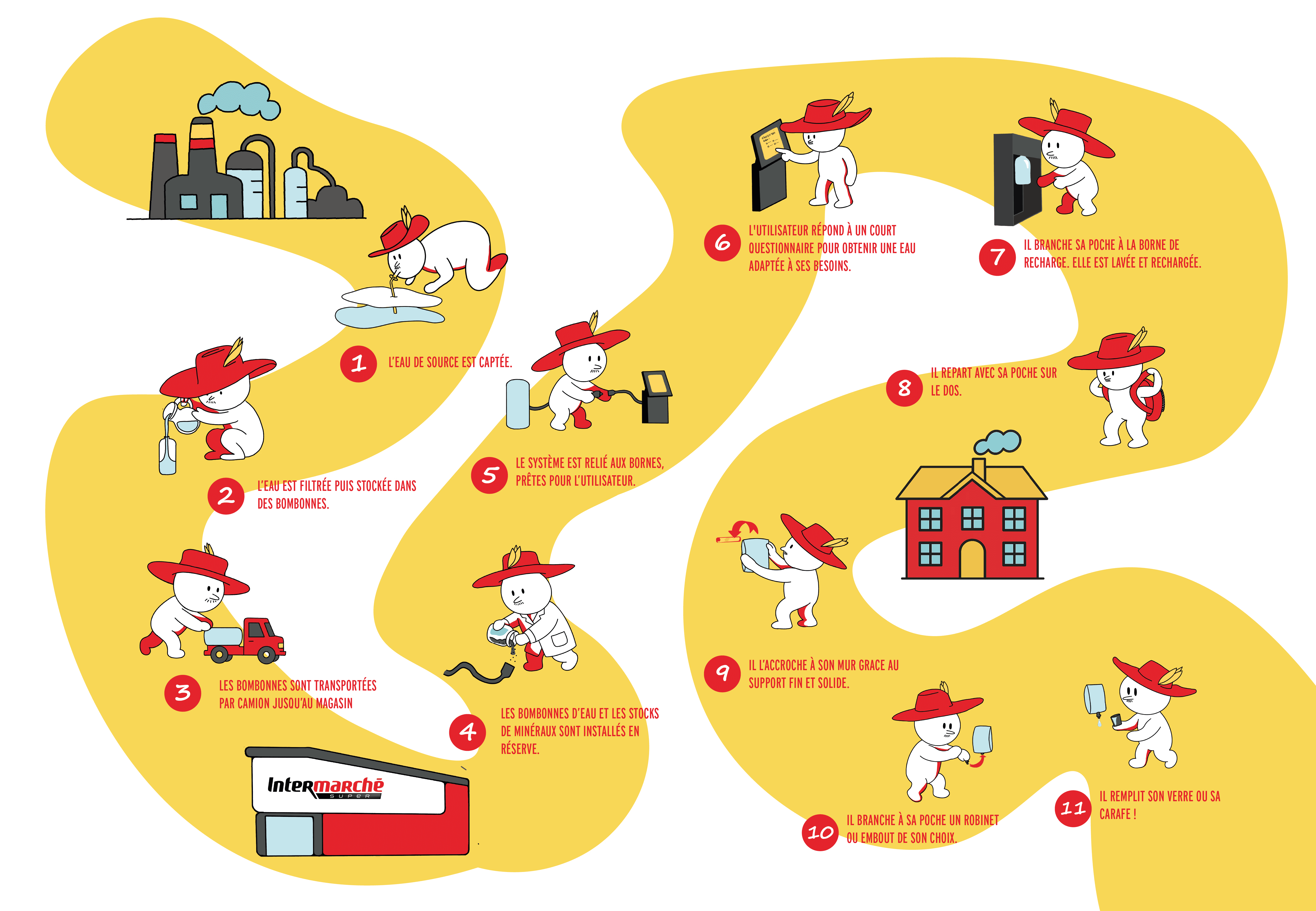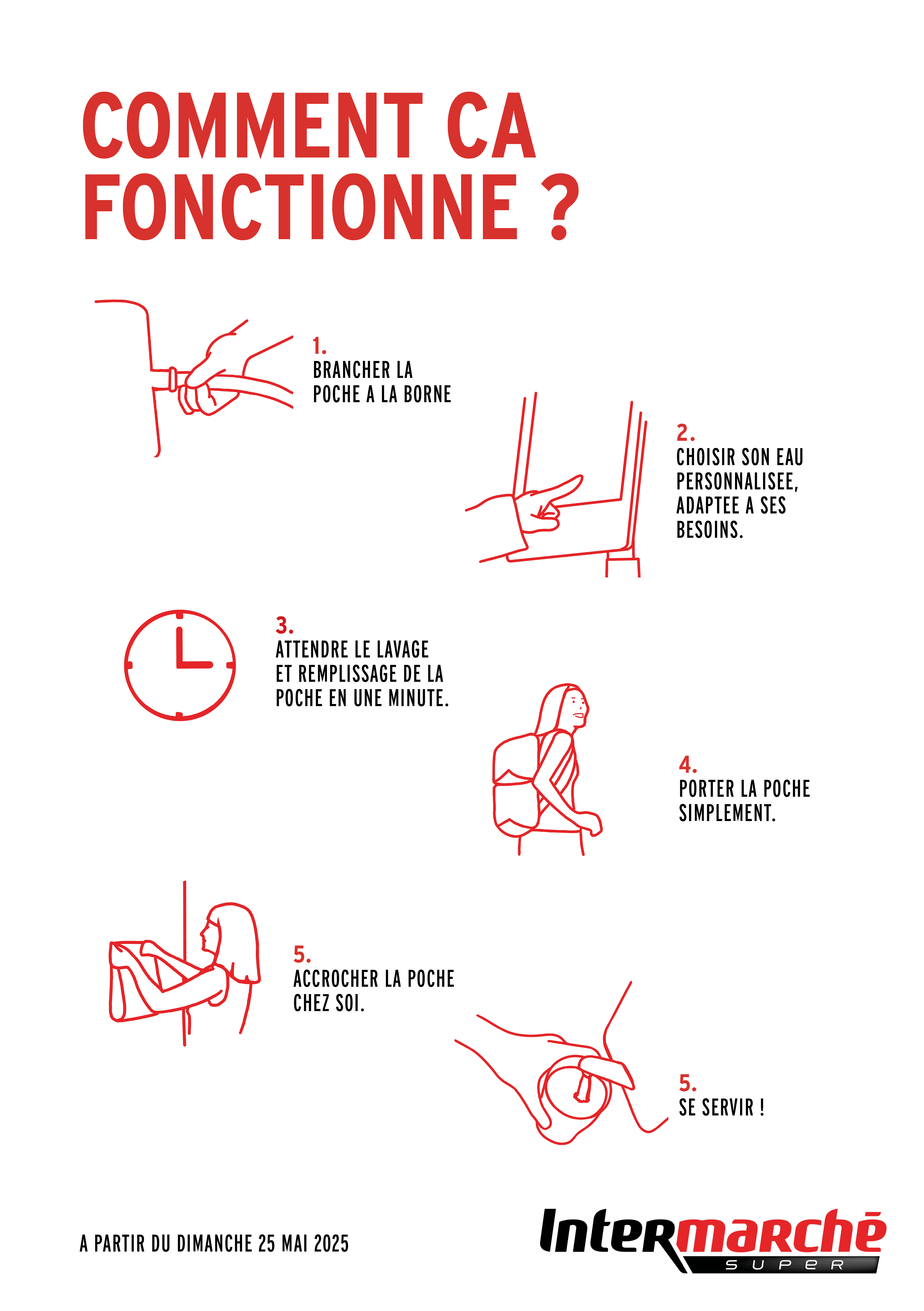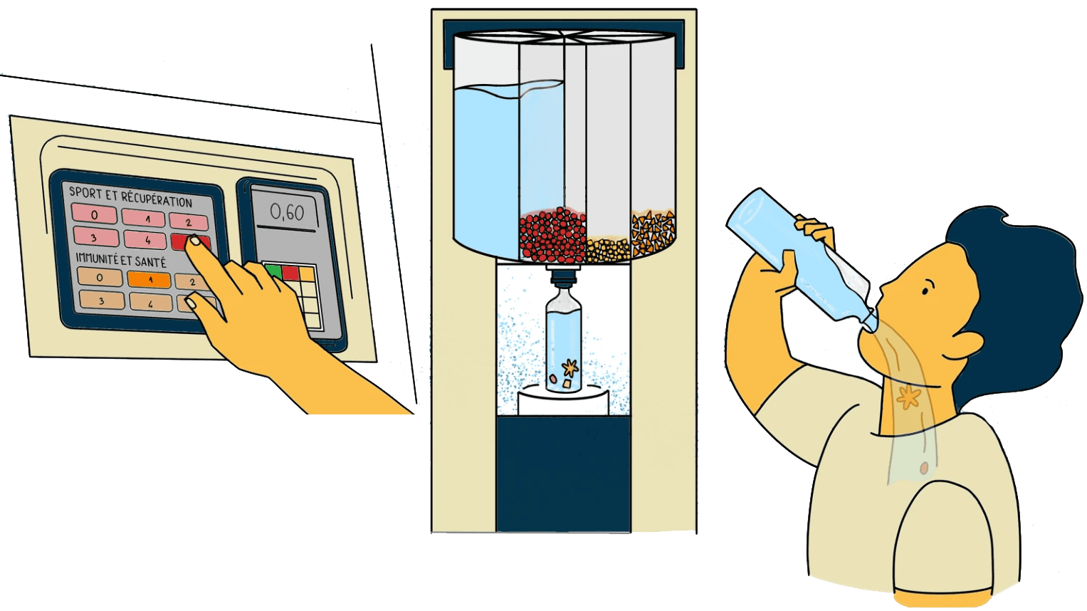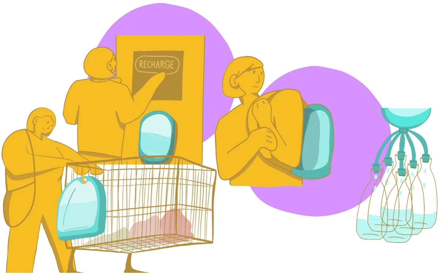 Poche d’eau réutilisable, rechargeable en borne au supermarché, personnalisable selon les besoins de chacun.